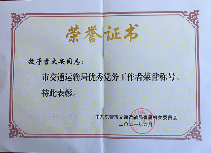 李大安榮獲“市交通運輸局優(yōu)秀黨務(wù)工作者”
